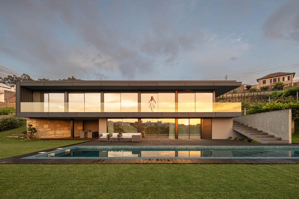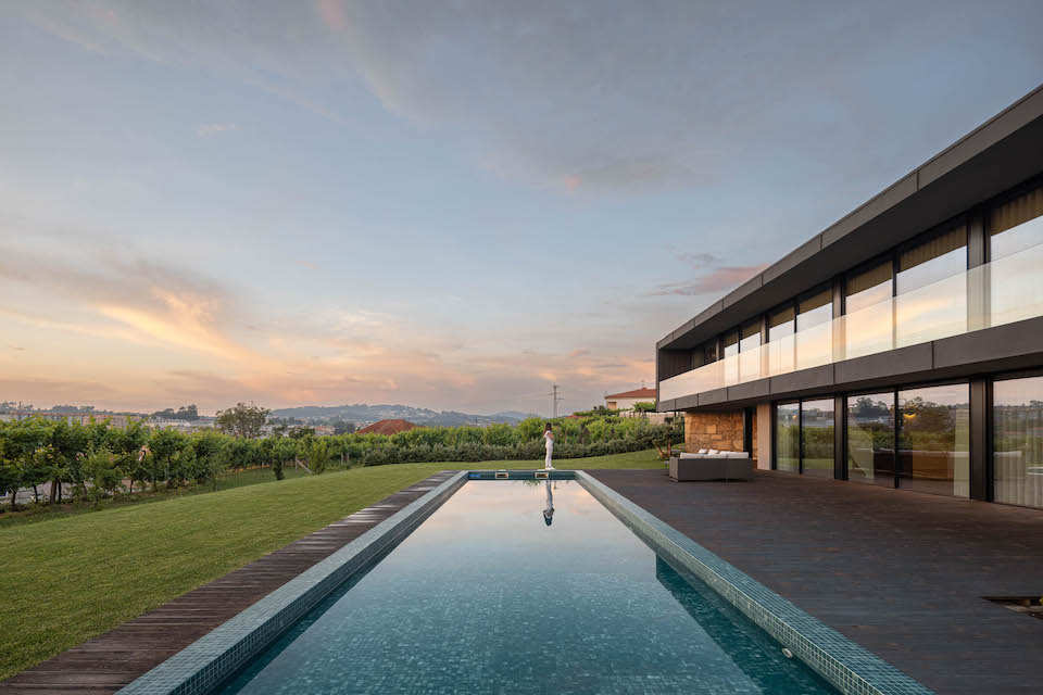 Os quartos resguardam-se do mundo com a intimidade certa: procuram a paisagem sem se fazerem procurados pelo exterior. São estes os momentos que ficam. Não as fotografias, não as descrições , mas o que o corpo guarda sem pedir autorização: o frescor da pedra num dia de verão, o cheiro da madeira numa manhã de inverno, a qualidade do silêncio de uma casa que foi pensada para quem a vive. A forma como um espaço nos recebe, nos acalma e, no fundo, nos devolve a nós próprios. Ao fim do dia, quando o sol de Santo Tirso toca a fachada envidraçada e a transforma em espelho da paisagem, as vinhas, o céu, a cidade que se adivinha ao longe, a Casa da Encosta revela com clareza aquilo que é: não uma declaração de arquitetura, mas uma declaração de vida. Com tempo. Com presença. Com a certeza silenciosa de que este lugar foi pensado, desde o início, para quem o habita.