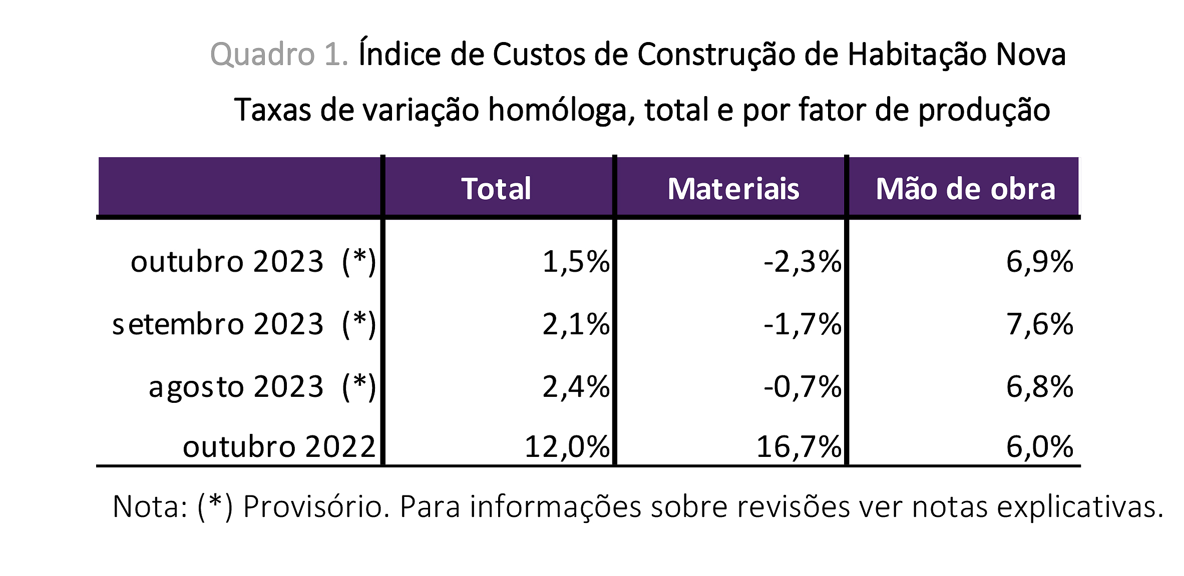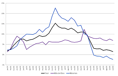 Os preços dos materiais apresentaram uma variação de -2,3% (-1,7% no mês anterior) e o custo da mão-de-obra aumentou 6,9%, menos 0,7 p.p. que em Setembro.