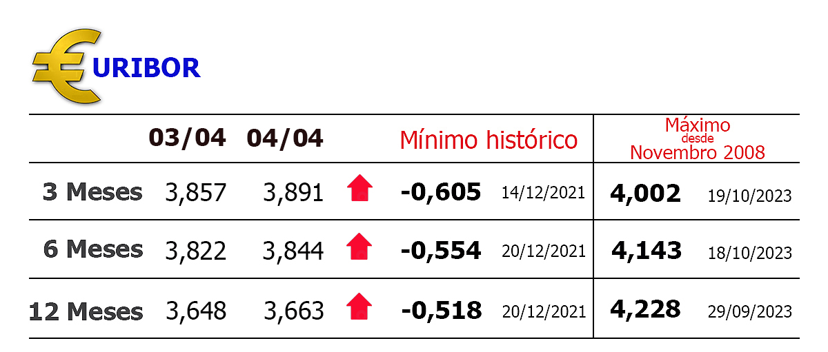 No mesmo sentido, a Euribor a três meses subiu, ao ser fixada em 3,891%, mais 0,034 pontos, depois de ter subido em 19 de Outubro para 4,002%, um novo máximo desde Novembro de 2008.