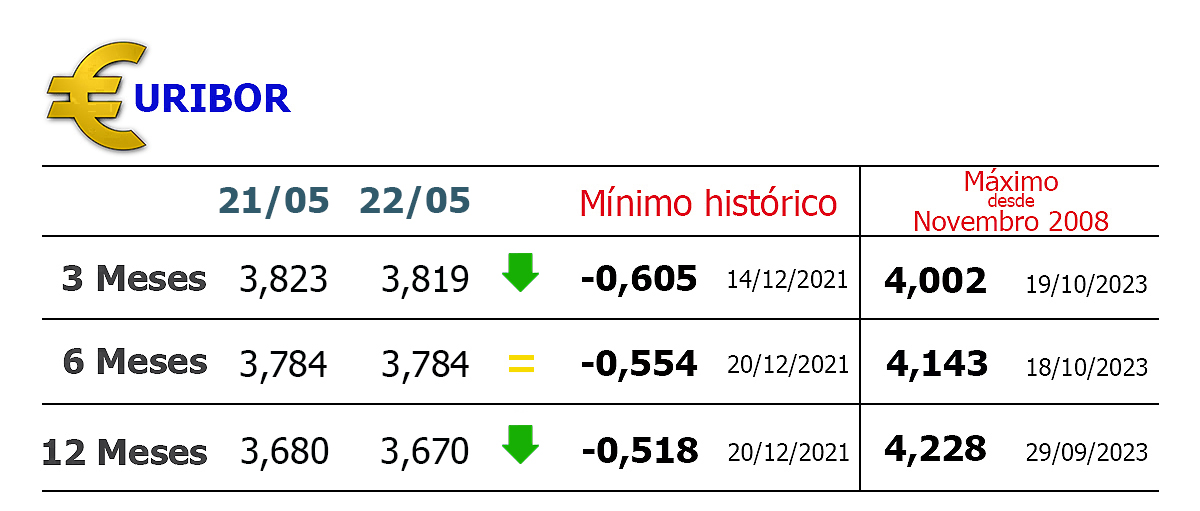 No mesmo sentido, a Euribor a três meses baixou, ao ser fixada em 3,819%, menos 0,004 pontos, depois de ter avançado em 19 de Outubro para 4,002%, um máximo desde Novembro de 2008.
