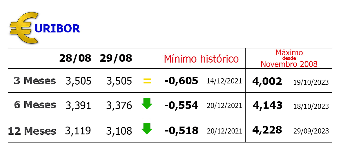 No prazo de 12 meses, a taxa Euribor, que esteve acima de 4% entre 16 de Junho e 29 de Novembro, desceu hoje 0,011 pontos para 3,108%, depois de no dia anterior ter subido 0,024 pontos para 3,119%.