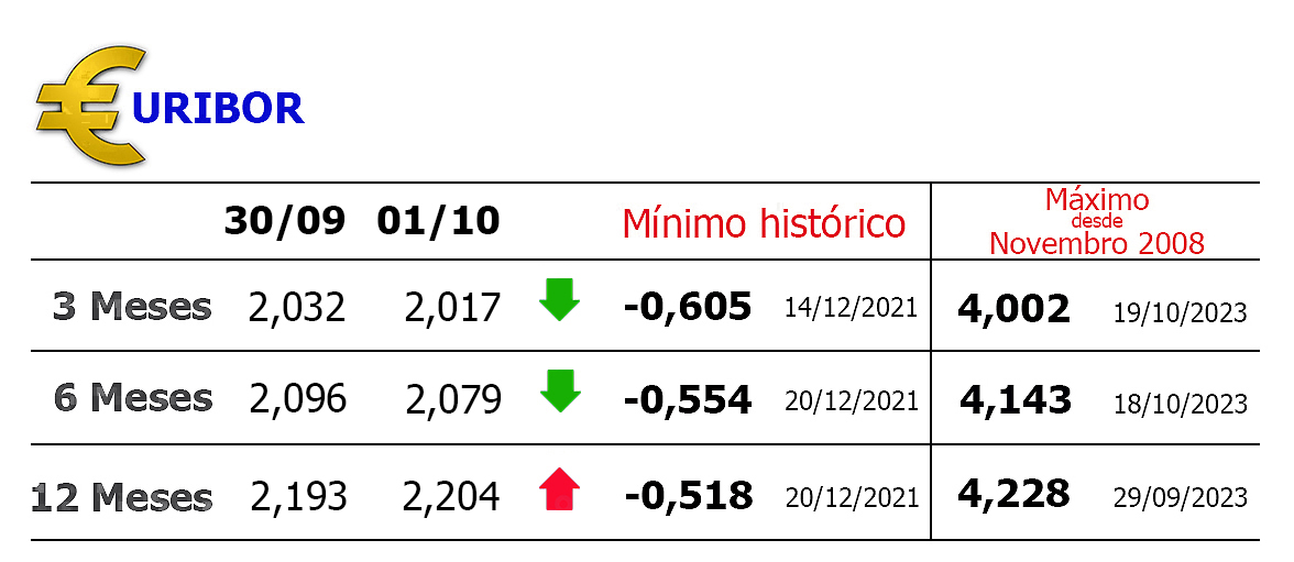 A média da Euribor em Setembro subiu 0,006 pontos para 2,027% a três meses e 0,018 pontos para 2,102% a seis meses.