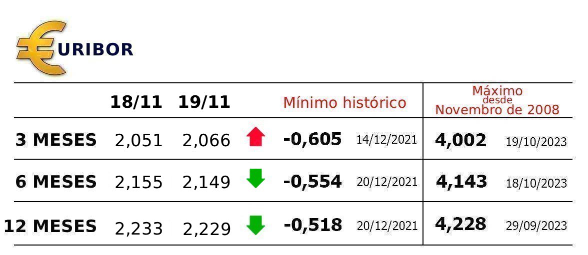 No prazo de 12 meses, a taxa Euribor também baixou, ao ser fixada em 2,229%, menos 0,004 pontos.