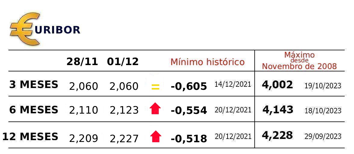 A média da Euribor em Novembro subiu 0,008 pontos para 2,042% a três meses. Já a seis e a 12 meses, a Euribor avançou 0,0024 pontos para 2,131% e 0,030 pontos para 2,217%.