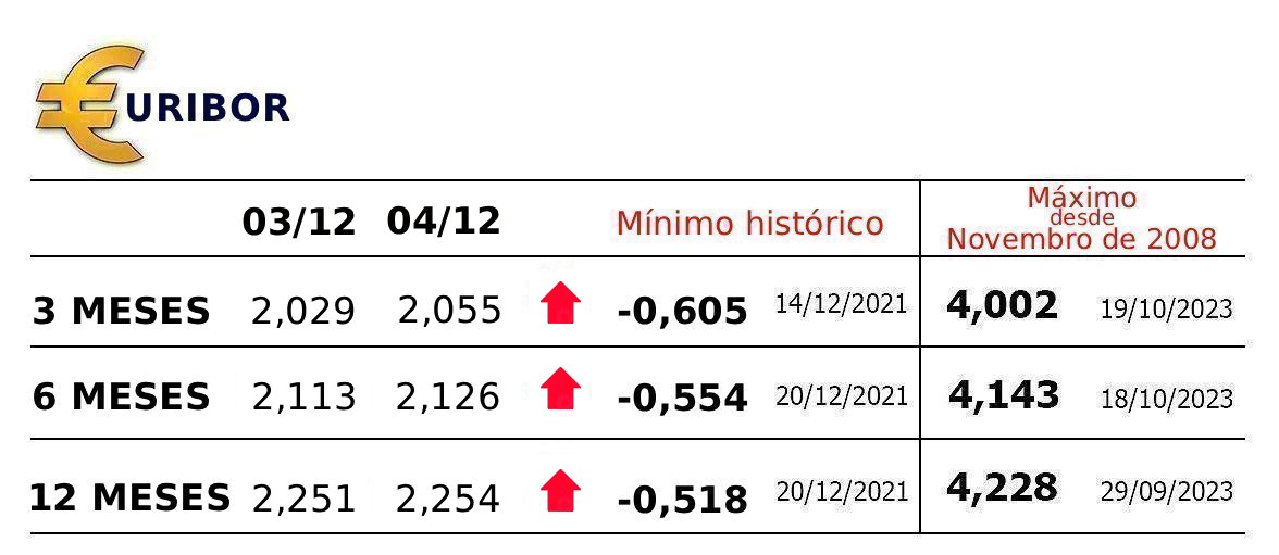 A média da Euribor em Novembro subiu 0,008 pontos para 2,042% a três meses. Já a seis e a 12 meses, a Euribor avançou 0,0024 pontos para 2,131% e 0,030 pontos para 2,217%.