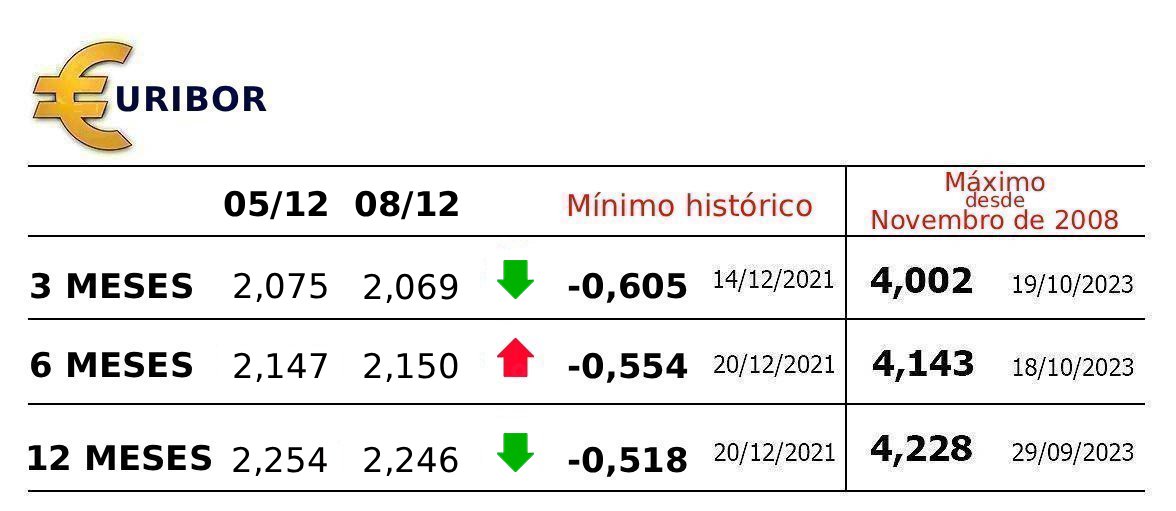 No prazo de 12 meses, a taxa Euribor desceu para 2,246%, face aos 2,254% anteriores.