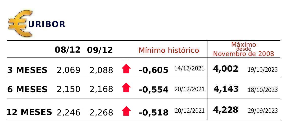 No prazo de 12 meses, a taxa Euribor avançou para 2,268%, face aos 2,246% anteriores.