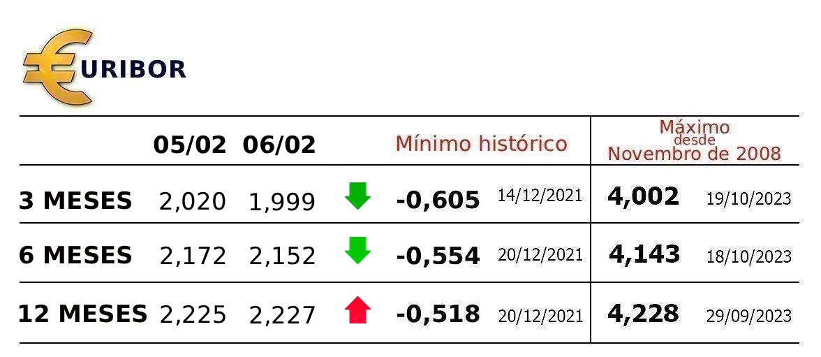 A média mensal da Euribor em Janeiro desceu 0,020 pontos para 2,028% a três meses e 0,002 pontos para 2,137% a seis meses. Já a 12 meses a média da Euribor recuou 0,022 pontos para 2,245%.