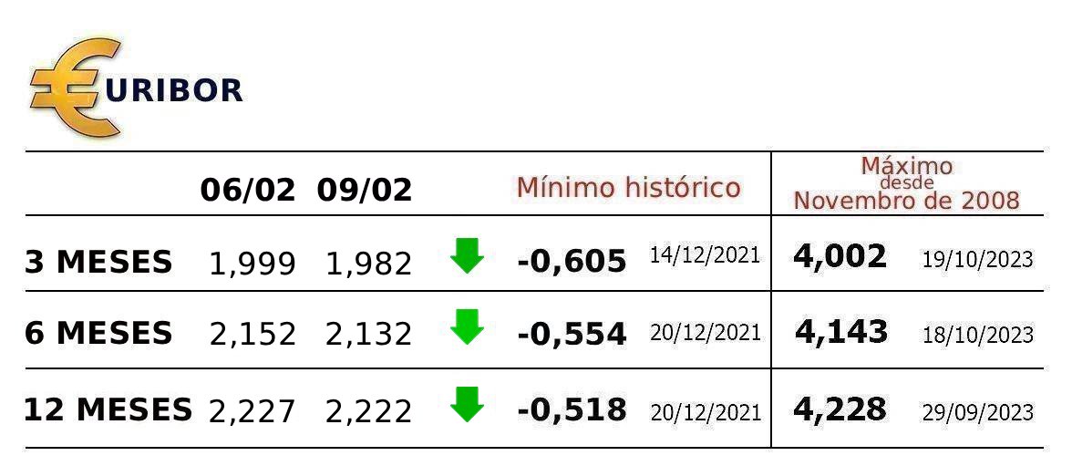 A taxa Euribor desceu hoje a três, a seis e a 12 meses em relação a sexta-feira e no prazo mais curto manteve-se abaixo de 2% pela segunda vez desde 06 de Novembro.