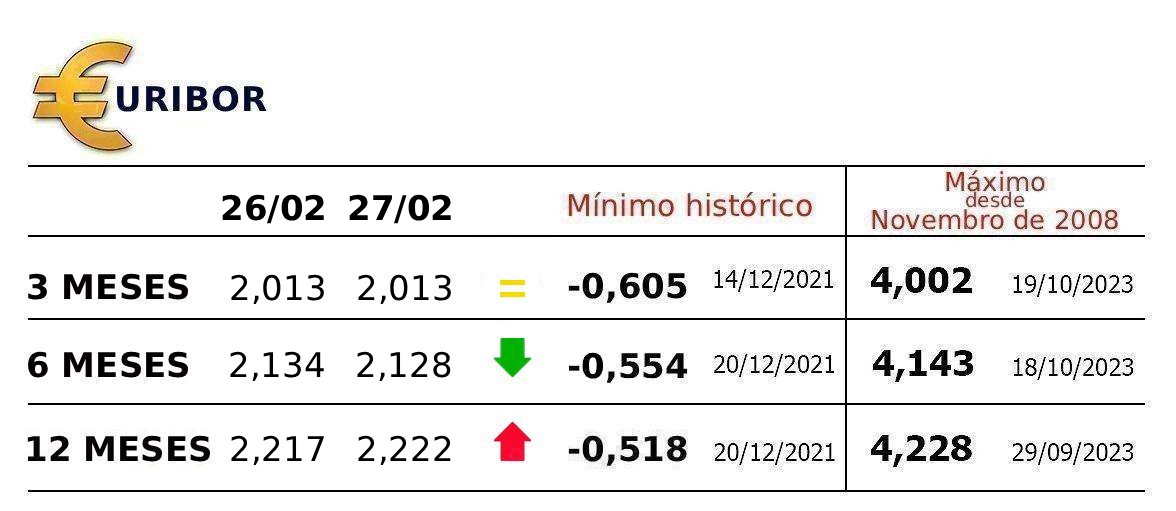 Em sentido contrário, no prazo de 12 meses, a taxa Euribor avançou hoje para 2,222%, mais 0,005 pontos.