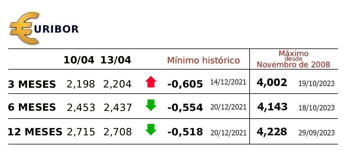 A média mensal da Euribor em Março avançou 0,098 pontos para 2,109% a três meses. Já a seis e a 12 meses, a média da Euribor subiu 0,178 pontos para 2,322% e 0,344 pontos para 2,565%.