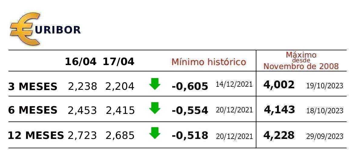 No mesmo sentido, a Euribor a três meses caiu hoje, ao ser fixada em 2,204%, menos 0,034 pontos.