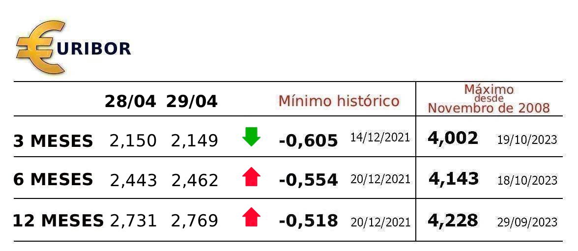 A média mensal da Euribor em Março avançou 0,098 pontos para 2,109% a três meses. Já a seis e a 12 meses, a média da Euribor subiu 0,178 pontos para 2,322% e 0,344 pontos para 2,565%.