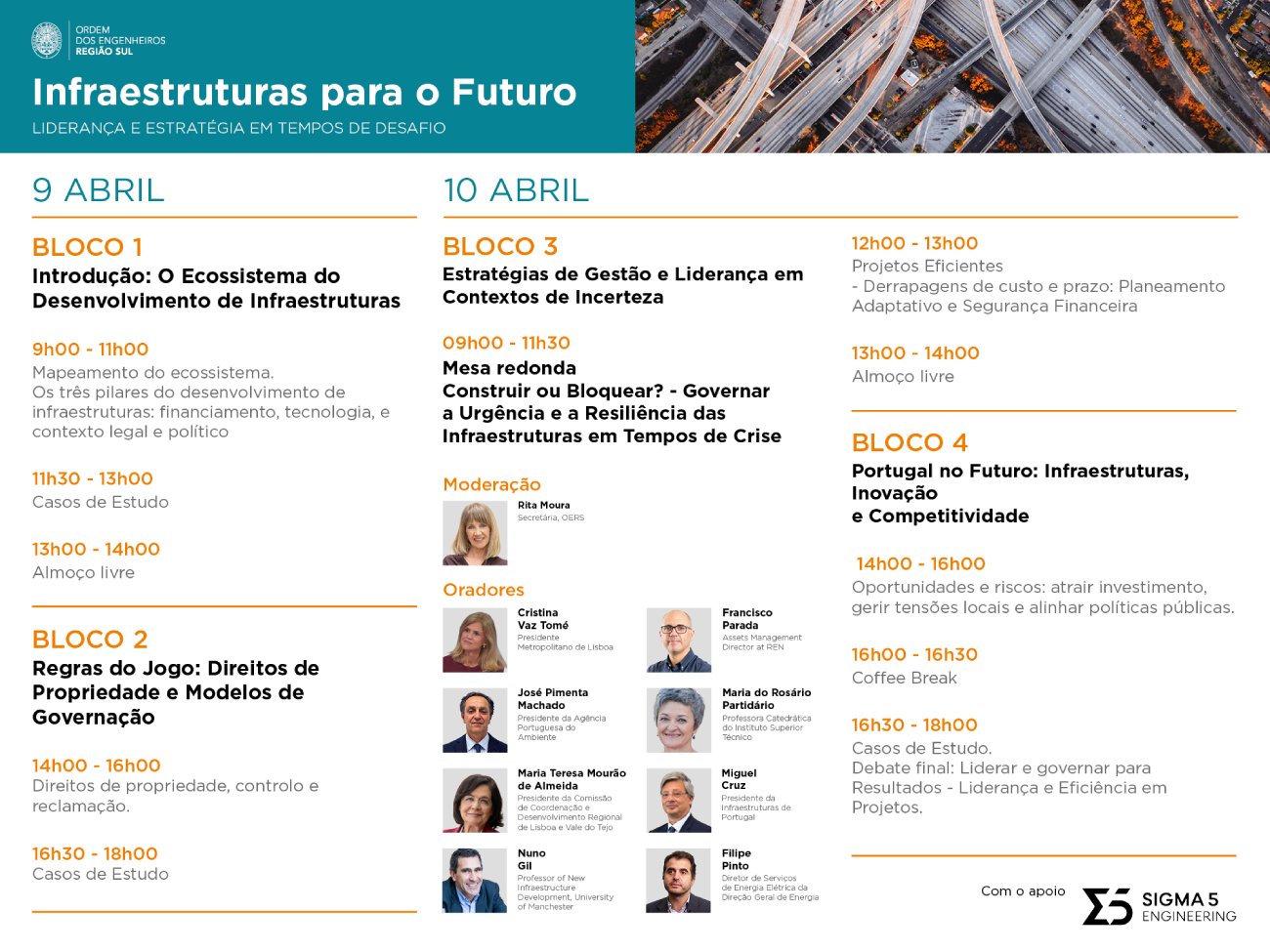 O seminário será conduzido por Nuno Gil, da Universidade de Manchester, e contará com a participação de responsáveis como Miguel Cruz (Infraestruturas de Portugal), José Pimenta Machado (Agência Portuguesa do Ambiente), Cristina Vaz Tomé (Metropolitano de Lisboa) e Paulo Carmona (DGEG).