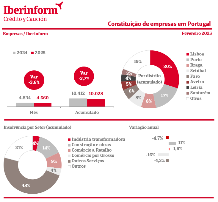 O número de acções de insolvência registado em Fevereiro aumentou em 21% face ao período homólogo de 2024, enquanto as constituições decresceram quase 4%.