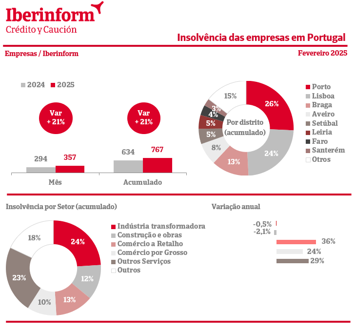 Segundo a Iberform da Crédito y Caución, as insolvências em fevereiro registaram 357 acções registadas, mais 63 que no ano transacto. O acumulado apresenta um total de 767 insolvências, mais 133 que em 2024, o que traduz um aumento de 21%.