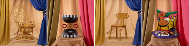 Benjamin El Doghaïli continua: “.O banco tem um pescoço alongado por anéis e as suas orelhas são adornadas com joias. O espelho em ráfia assemelha-se a um adorno sagrado para rituais; uma poltrona, como um formato quase infantil de um assento mas de grandes dimensões. A mesa é como uma bancada de trabalho à volta da qual se pode comer, brincar e sonhar. O banco corrido destina-se a acomodar várias pessoas. A cadeira, inspirada na cadeira Savoyard, torna-se num totem robótico de madeira. O candeeiro é quase um chapéu oriental que nos ilumina discretamente. A pièce de résistance, a cadeira Emmanuelle, é toda ela corações, com uma almofada com um padrão que recorda todas as peças de assinatura da colecção”.