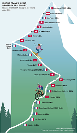 Courchevel 1850, em França, liderou com uma valorização de 9% das propriedades, enquanto Gstaad, na Suíça, manteve o título de destino mais caro, com preços a atingir, em média, os 41.500 euros por metro quadrado, reflectindo um crescimento anual de 4%.