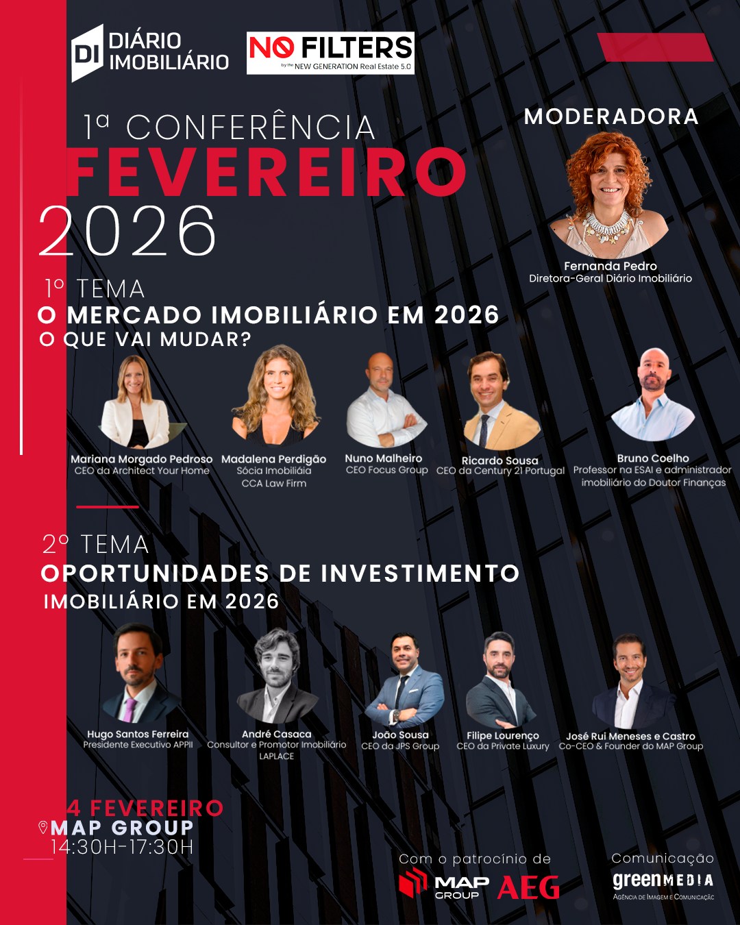 A primeira conferência de 2026 dos NO Filters - A nova geração do Imobiliário, vai realizar-se esta semana, no dia 4 de Fevereiro, no auditório do MAP Group, localizado no Edifício Amoreiras Square, a partir das 14h30. No primeiro tema em debate: O mercado imobiliário em 2026, o que vai mudar? o painel é composto por: Mariana Morgado Pedroso, CEO da Architect Your Home; Madalena Azeredo Perdigão, sócia Imobiliário CCA Law Firm; Nuno Malheiro, arquitecto e CEO do Focus Group; Ricardo Sousa, CEO da Century 21 e Bruno Coelho, professor na ESAI e administrador de Imobiliário no Doutor Finanças.