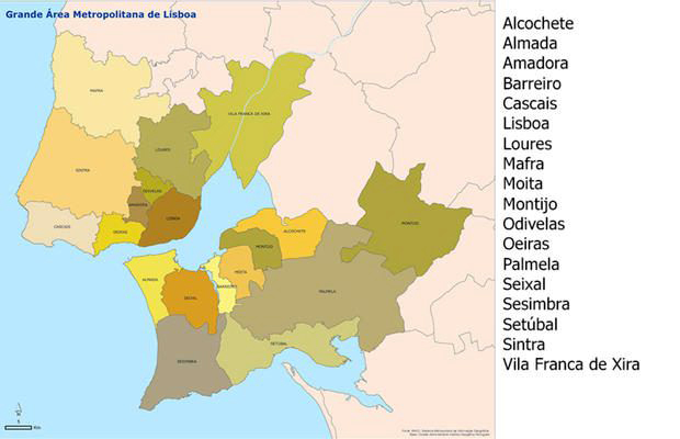 A AML é a maior área urbana do país e abrange os municípios de Alcochete, Almada, Amadora, Barreiro, Cascais, Lisboa, Loures, Mafra, Moita, Montijo, Odivelas, Oeiras, Palmela, Seixal, Sesimbra, Setúbal, Sintra, Vila Franca de Xira.