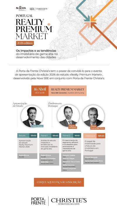 A Porta da Frente Christie's International Real Estate e a NOVA School of Business & Economics promovem no próximo dia 16 de Abril, em Carcavelos, uma sessão dedicada ao futuro da habitação em Portugal, marcada pela apresentação da nova edição do estudo “Realty Premium Market”.