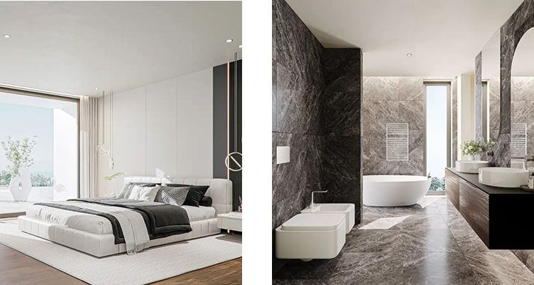 Cada moradia T4, com cerca de 507 m² distribuídos por três pisos, dispõe de sala com vista de mar, cozinha equipada com eletrodomésticos Gaggenau, quartos “en suite”, lavandaria, garagem e amplos terraços. Os jardins privativos, muros em pedra e piscinas infinitas aquecidas reforçam a integração com a paisagem natural.