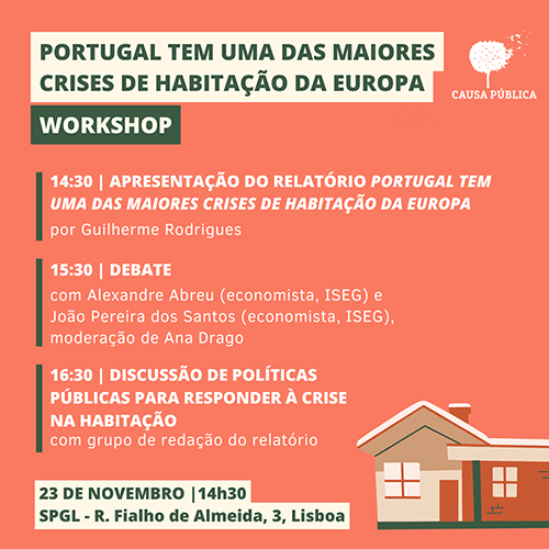 A “Causa Pública”, associação de cidadãs e cidadãos empenhados na construção de novos caminhos para Portugal, presidida pelo sociólogo Paulo Pedroso, organiza no sábado, dia 23 de novembro, pelas 14h30, na sede do Sindicato dos Professores da Grande Lisboa ( R. Fialho de Almeida 3, Lisboa) um workshop sobre o tema: “Portugal tem uma das maiores crises habitacionais da Europa”.